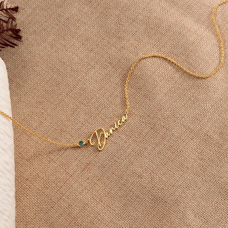 Add a touch of sparkle and meaning to your look with our Handmade Birthstone Name Necklace. Each piece is carefully handcrafted to reflect your personality, making it a truly special accessory. Featuring a custom name and dazzling birthstone, this necklace is designed to keep your loved ones close to your heart.